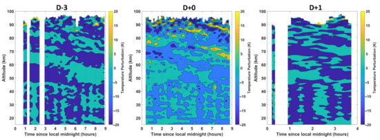 NASA’s Ionospheric Connection Explorer (ICON) satellite was launched on 10 October 2019 into a near-circular orbit at 590 km with an inclination of 27°. ICON’s primary mission is to study the interactions between the neutral atmosphere and ionosphere using instruments that measure winds, temperatures, and composition [46]. For this study, we used the Michelson Interferometer Global High-resolution Thermospheric Imaging (MIGHTI) instrument, which measures both the winds and temperatures in the MLT. MIGHTI winds were found using the Doppler Asymmetric Spatial Heterodyne (DASH) technique on both red and green airglow layers, giving an overall altitude range of 90 to 300 km [47,48,49]. MIGHTI temperatures were found using the ratios of the A Band emissions, giving an overall altitude range between 90 and 105 km, with a vertical resolution of approximately 2.9 km [50]. The ICON-MIGHTI data discussed below are within a 1000 km radius of the launch site for all dates.