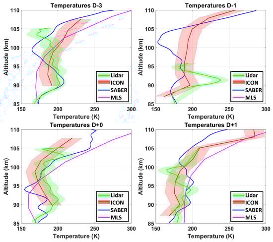 The 2020 Monge campaign provided a unique opportunity to validate the newly launched ICON satellite temperature using a high-powered Rayleigh lidar. In Figure 6, we have re-plotted Figure 4 from 85 to 110 km in an effort to assess the ICON temperatures in the MLT. On night D−3, the ICON temperatures were not statistically different from the Monge lidar temperatures between 90 and 103 km and were equal to the SABER temperatures between 94 and 97 km. It is likely that the temperature differences outside these altitude ranges can be attributed to the comparatively coarse vertical resolution of ICON, the temporal and spatial coincidence between the three instruments (approx. ±700 km and ±8 h), and tidal effects. Tidal effects at tropical latitudes can account for up to a 15 K temperature difference at 115 km, depending on the phase offset between ICON and the lidar Hagan and Forbes [71]. On D−1, it appears that all three instruments saw a layer above 90 km. D+0 and D+1 were the best comparisons between the lidar and ICON. The measurements were equal over the entire overlap altitude, and they followed the same general temperature profile. Excluding night D−1 (only 20 min of lidar data), the maximum average temperature difference (ICON-lidar) was −16 K at 95 km, 1 K at 100 km, and 24 K at 105 km. The standard deviation was approx. 4 K below 100 km.