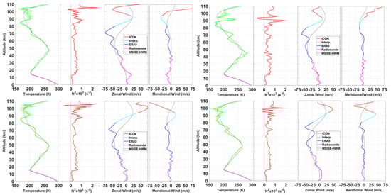 Profiles of merged temperature (green), Brunt–Väisälä frequency (orange), estimated composite zonal wind, and estimated composite meridional wind (magenta, blue, cyan, and red) for D−3 (upper left), D−1 (upper right), D+0 (lower left), and D+1 (lower right).