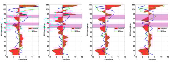 When we plot the vertical gradients of the profiles as in Figure 7, we can investigate the behavior of the temperature and winds as an indicator of forming MILs. In Figure 8, we show the temperature gradient as a function of altitude for temperature using red bars. The slope of the bars represents the vertical rate of change in the temperature gradient, . By representing the data in this way, we wish to show the bottom-side lapse rates of MILs (and forming MILs) more clearly. In general, we can see that the lapse rate is negative in the troposphere and mesosphere and positive in the stratosphere and thermosphere. There is evidence of wave-driven changes in the lapse rate in both the stratosphere and mesosphere. We have highlighted the regions in the mesosphere where the rate of change in the temperature gradient is positive and associated with the bottom side of the MILs observed near 70 and 90 km. The zonal and meridional wind lines represent the vertical gradient of the wind in the north and east directions.