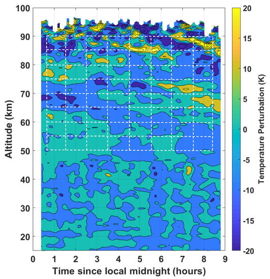 We chose to make a case study of the night of the rocket launch because it had the most interesting features from both a geophysical and from a military engineering perspective. In Figure 9, we have reproduced the middle panel of Figure 5 and superimposed a white dashed grid on which we conducted a wavelet analysis. We centered the grid at 5 km intervals from 50 to 90 km and at every hour on the half hour. The top of the figure is masked when the temperature uncertainty in the 5 min lidar profile exceeded 10%. We did not extend the analysis to 95 km, as some data are under the mask. Our intent here was to perform a very conservative perturbation analysis so that we could maintain a high degree of confidence in the detection of small-scale features.