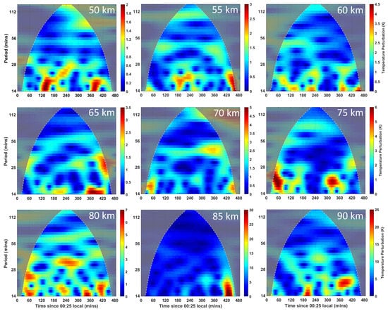 In Figure 10, we see nine frames that represent the continuous wavelet transform scalogram taken along the horizontal grid lines shown in Figure 9. On the ordinate of each scalogram subplot is the period of the wave (the scale is log(2)), and the abscissa corresponds to the number of minutes since the start of the lidar measurement at 00:23 local time. The grayed-out region of each scalogram is the Cone of Influence (CoI), which represents the period-time spaces that are influenced by the edges of the dataset (e.g., near the top of each sub-figure, more space is grayed out, as fewer wavelets of periods greater than 120 min can be fitted into a 9 h dataset). The color scale of the plots represents the amplitudes of the temperature perturbations of each wave. N.B. the scale of the perturbations increased with altitude. The temperature perturbations at 90 km can be an order of magnitude larger than the temperature perturbations at 50 km.