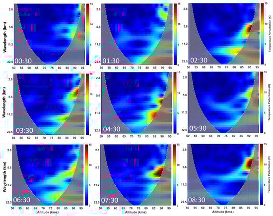 Wind–wave interactions can cause a traveling GW or long-period wave to lose energy when the phase speed of the wave exceeds the background wind speed (zero wind from the perspective of a traveling wave) [36]. We expect that the majority of the GW energy is dissipated in the region between 85 km (mesopause) and approx. 105–110 km (the so-called turbopause above which the molecular viscosity is the dominant dispersive term). We also expect that the longer-intrinsic-wavelength GWs encounter a zero-wind line at lower altitudes than shorter-intrinsic-wavelength GWs, which can propagate to higher altitudes.