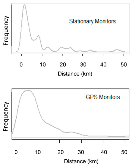 Smoke was sampled using low-cost particulate monitors housing a Nova SDS011 sensor, which measures PM2.5 and PM10 concentrations. The Nova sensor combines a fan and laser scatter sensor, and the output signal is converted into an estimated particulate concentration using a predetermined equation. Our monitors were built by the SMART (Simulation, Modelling, Analysis, Research and Teaching) Infrastructure Facility’s Digital Living Lab at the University of Wollongong, combining the sensor with an Arduino controller, clock, storage device and additional fan to ensure air flowed through the housing [21]. Forehead, Barthelemy [21] compared the performance of Nova sensor to two others commonly available and considered it to be the best. They also tested it against a reference monitor operated by the NSW DPIE (Beta Attenuation Method (BAM) TEI 5014i/TEI 5030) and found good correlation (r2 = 0.858) and similar PM2.5 values, even at concentrations below 10 µg m−3. At each fire, between 7 and 11 Nova monitors were positioned at varying distances and directions, with the precise locations determined by accessibility and the forecast wind direction (more intense sampling downwind), sampling every minute. The median distance to the fire was 5.3 km from the perimeter, with 14% of deployments within 1 km and 10% greater than 20 km. At most of the fires, we also fixed a GPS-enabled version of the monitor to a vehicle and drove around the fire during the day, with median observation distance of 7.8 km and 3% of observations within 1 km and 15% greater than 20 km (Figure 2). The GPS was fixed to the front bumper of the vehicle, and testing indicated that the readings were not affected by the exhaust from the rear. The duration of the monitoring varied among the fires from 8 to 48 h depending on the fire duration.