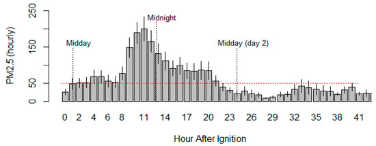Average time trace for the combined hourly observations (excluding those >5 km from the fires). The dashed line indicates the 50 µg m−3 hourly exceedance threshold.