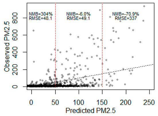 Plot of predicted vs. observed PM2.5 in the test data (20% random selection). The mean bias and RMSE are shown for three portions of the data, with predicted PM2.5 < 50, between 50 and 200 and >200 µg m−3. The line of agreement (1:1) is added as a dashed line.