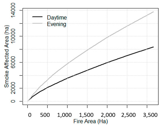 Applying model predictions to all wind angles at increasing fire areas, predicted a non-linear (asymptotic) relationship between fire area and smoke-affected area (Figure 11). The predicted area affected by hourly exceedance for a 500 ha prescribed burn will be approximately 2000 ha in the daytime and 5000 ha in the evening (Figure 11). A 3000 ha burn will affect 8000 ha in the daytime and almost 14,000 ha in the evening.