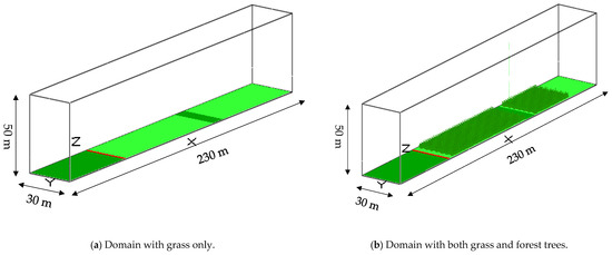 The numerical domain is 230 m long, 30 m wide and 50 m high, as shown in Figure 1. In Figure 1a, there are five sections with the following color schemes: dark green (from left) for the unburned grass, red for line fire, light green for burnable grass, dark green for firebreak and light green for burnable grass sections beyond. The burnable vegetation section is modified in Figure 1b with the inclusion of columns and rows of trees. The ignition line (red colour), 2 m depth and 30 m width, is situated at 58 m from the inlet of the domain in both cases. It represents a line fire ignited simultaneously at 620 s simulation time (after the well-developed wind field).