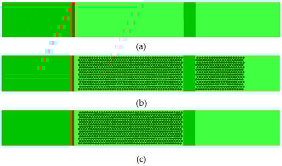 We artificially injected eddies to the domain to make sure that the initial perturbation to the flow field and the subsequent development of wind flow take place quickly. The cases, shown in Table 2, were set up for three driving wind velocities: 2.5, 6.0 and 12.5 m/s (at 2 m above the ground at inlet) while the vegetation layout was varied as shown in Figure 2a–c. In this study, a grass height of 1.0 m was chosen for studying the effect of tall grass. According to Moor [23], in Australia major tall grass can be >90 cm. The fuel load was 12 t/ha (1.2 kg/m2). The trees of this study represent a typical Australian Chapparal vegetation composed of broad-leaved evergreen shrubs, bushes, and small trees. The vegetation layout is shown in Figure 2a–c. The vegetation layout is modified with the inclusion of forest vegetation on the burnable section before and after the firebreak. There are 20 cases simulated in total as shown in Table 2 for 4 break widths (Lc): 5, 10, 15 and 20 m.