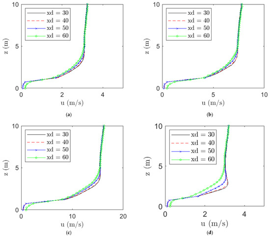 The wind field development at different stream-wise locations is shown at varying wind velocities with respect to the height. The streamwise mean velocity as function of height is shown before the ignition to start, xd stands for x distance from the inlet of the domain. (a) Velocity 2.5 m/s with grass; (b) Velocity 6.0 m/s with grass; (c) Velocity 12.5 m/s with grass; (d) Velocity 2.5 m/s with grass and forest.