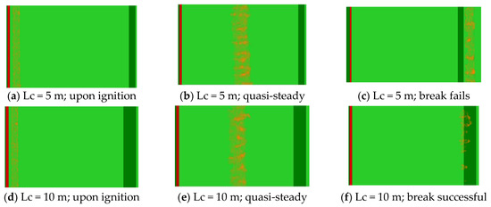 The contour plot of HRRPUV for 2.5 m/s velocity cases taken from Smokeview (a companion software of WFDS). The break fails at Lc (break width) = 5 and is successful at Lc = 10. The colour scheme follows previous graphs additionally, dark orange represents heat release rate per unit volume (HRRPUV with a fire cut off value of 80 kW/m3). The timesteps of simulation are shown for each panel in seconds. (a) time-636 s; (b) time-780 s; (c) time-916 s; (d) time-636 s; (e) time-780 s; (f) time-905 s.
