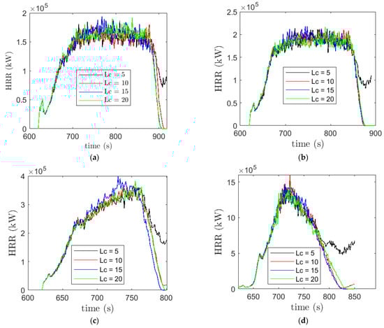 Among the grass cases, as expected [18,25], the HRR increases with the increase of velocity from 2.5 m/s to 12.5 m/s. For the event of a successful break, the HRR falls to zero as the fire is extinguished and could not propagate to the other side of the break. The transition from grass to forest fire cases (Figure 6d) is highly fire-intensive, which shows a triangular-shaped distribution of the HRR. Moreover, the HRR does not change much before the firebreak regions with varying break widths and the HRR profiles collapse onto each other at Lc = 5, 10, 15 and 20 m before the break. At the same time, the HRR starts to grow after the firebreak for the unsuccessful cases (Figure 6).