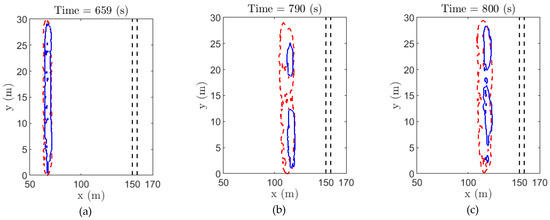 As the heat flux varies due to wind velocity, atmospheric conditions and thermophysical parameters of vegetations, there is no physical threshold value for the heat flux. We have filtered data to find the trailing edge of pyrolysis regions, where data are normalised to generate the range from 0 (T < 400) to 1(T ≥ 400) and the contour plots are presented at 0.5, where T stands for the temperature of the flame. Therefore, 50% of the heat transfer occurs inside of the contour. The contour plots are taken at random time steps to show the changes in time and space of heat transfer in the numerical domain up to firebreak regions. In the beginning, the convective (blue) and radiative heat flux (red) contours are overlapping each other (Figure 7). The convective flux contours lie ahead of radiative contours at the end of 800 s. At a higher velocity case (Figure 8), as of 12.5 m/s, the convective contours clearly lie ahead of radiative contours during all the times. These results are demonstrating that the convective heat flux is leading over the radiative heat flux as the driving wind velocity is increasing. With the higher the driving wind velocity, the more propagation becomes wind-driven and convective heat flux becomes more relevant.