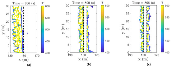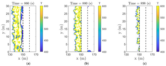 The surface temperature is an indicative of heat transfer from flames to the surrounding fuels. Whether it is due to radiative or convective heat flux, the surface temperature is a single parameter that can be useful to measure extend of heat transfer to the vegetation that may reach pyrolysis temperature. The contour plot of temperature is shown in Figure 9 and Figure 10 for the two break widths, 5 m, and 10 m, respectively, for the 2.5 m/s velocity cases. The contour data are filtered for a limit of 400–600 K to see whether the vegetation is hot enough to continue the fire propagation. The break was failed at 5 m width at a velocity of 2.5 m/s (Figure 9), where we observe the threshold temperature appearing on the other side of the firebreak. On the other hand, the firebreak was successful at a break width of 10 m (Figure 10), which shows only a few dots of temperature around 400 K to appear in the other side of the break at a time of 880 s. However, this discrete temperature value of around 400 K was not sufficient to ignite the required amount of vegetation on the other side of the break. It demonstrates that the fire did not propagate on the side of the break, even though the temperature was around 400 K.
