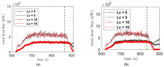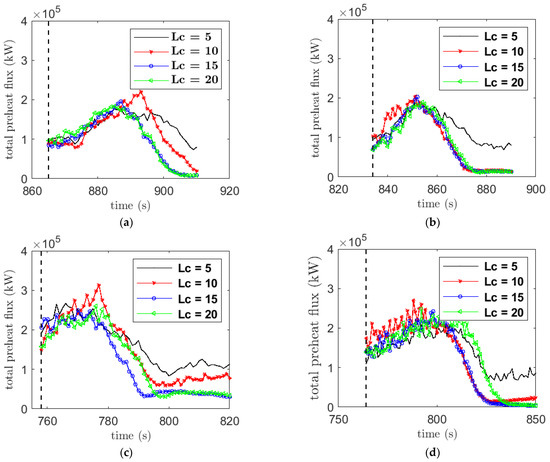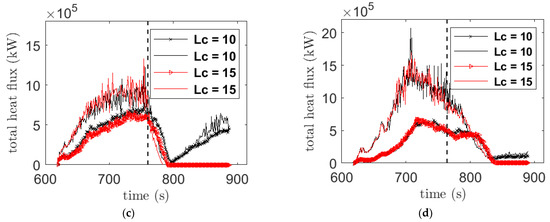 The preheat flux is defined as the amounts of heat flux transferred to burnable vegetation ahead of the fire front location, while the temperature is still below the pyrolysis temperature (400 K) of vegetation. The preheat flux after firebreak indicates the strength of heat flux at break regions, which is useful to understand the effectiveness of break widths. The preheat flux is shown in Figure 13 for 16 cases (excluding the set with forest on both sides of the firebreak). The preheat fluxes are shown for all the four break widths, which show variation of fluxes with respect to widths as expected. For velocity 2.5 m/s, the successful widths were 10, 15 and 20 m, which is reflected in the preheat flux results although at Lc = 10, the heat flux was relatively higher at some point compared to the Lc = 5 case, but the fire was unable to cross the break width. For velocity 6.0 m/s, the successful break widths were also 10, 15 and 20 m but the preheat flux at Lc = 10 was following similar trend to the higher break width cases (Figure 13b). Interestingly, this difference in flux profiles with 2.5 m/s and 6.0 m/s cases at Lc = 10 may be due to the mechanism of heat transfer as depicted in Figure 12a,b, as these two cases represented different mechanisms of heat transfer process. For the cases with 12.5 m/s and 2.5 m/s with forest trees, in Figure 13c,d, there is a smooth variation of fluxes with respect to their break widths and the successful break widths in these cases were 15 and 20 m; respectively. The peak total preheat flux, which includes both radiative and convective heat flux, is of order 3 × 105 kW, which is much lower than the combined radiative and convective fluxes as shown in Figure 11 before the break regions. For the unsuccessful firebreak cases, it appears that the break fails when preheat flux reaches above the range of 0.5 × 105~1 × 105 kW as opposed to successful break cases when preheat flux falls below 0.5 × 105 kW. This preheat flux range can be useful in designing a real firebreak.