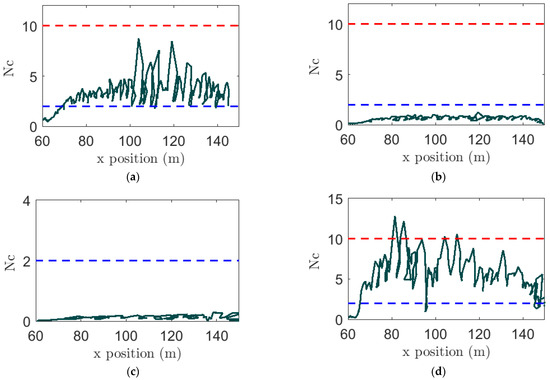 Non-dimensional Byram number, Nc as a function of fire front location is shown for four cases with different velocities by black lines. The red and blue dashed lines represent NC values of 10 and 2, respectively. (a) Velocity 2.5 m/s with grass; (b) velocity 6.0 m/s with grass; (c) velocity 12.5 m/s with grass; (d) velocity 2.5 m/s with grass and trees before break.