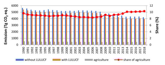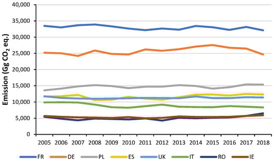 | Country | Agricultural GHG Emission in 2018 (Gg CO2 eq.) | Changes in Agricultural GHG Emissions for 2005–2018 (%) | GHG Emission Limits in 2020 Compared with 2005 GHG Levels (%) | Reduction of GHG Emissions in 2030 Compared with 2005 GHG Levels (%) |