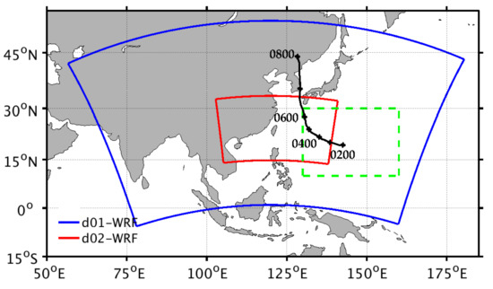 - Li, D.Y.; Huang, C.Y. The influences of orography and ocean on track of Typhoon Megi (2016) past Taiwan as identified by HWRF. J. Geophys. Res. Atmos. 2018, 123, 11492–411517. [Google Scholar] [CrossRef]
