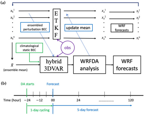 (a) The flowchart of the hybrid WRFDA data assimilation system. The ETKF employs 32 members with the outermost domain to provide the background error covariance. Both ETKF and 3DEnVar were conducted for the domain with the 15-km resolution, and the final analysis was adopted for the two domains of 15-km and 3-km resolutions. (b) The experimental design. Each simulation was carried out by 1-day cycling data assimilation with a 6-h cycling interval and then forecast for 5 days.