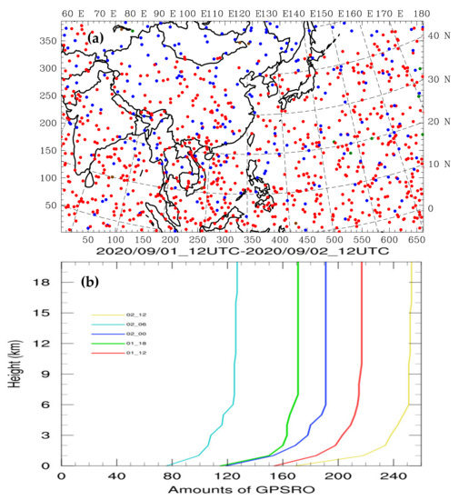 (a) The horizontal distribution of GNSS RO data during the 1-day DA period. There was a total of 959 RO soundings in the outermost domain, including 724 data from FORMOSAT-7/COSMIC2 (red), 222 from MetOp (blue), 7 from KOMPSAT-5 (green), and 6 from PAZ (brown). (b) The vertical variation of the amounts of accumulated RO soundings at each DA cycling, e.g., 01_12 indicates the DA time at 1200 UTC 01 September 2020 (the first DA cycle), and 02_12 is for the DA time at the final DA cycle.