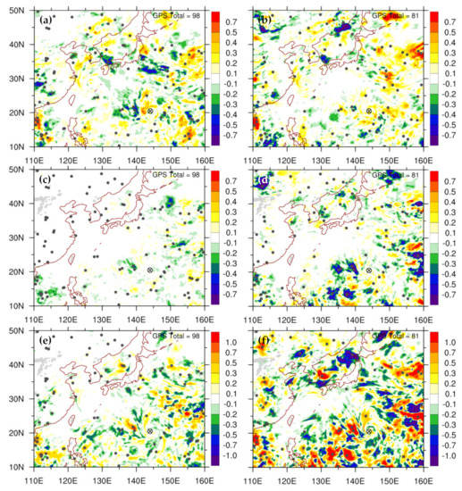 (a) Difference in temperature (shaded colors; K) at 500 hPa between REF and GTS after the first DA cycle at 1200 UTC 1 September. (b) as in (a), but between EPH and GTS. (c,d) as in (a,b), respectively, but at 850 hPa. (e,f) as in (c,d), respectively, but for water vapor mixing ratio (shaded colors; g kg−1). The dot points indicate the locations of GNSS RO, and the circled cross symbol indicates the center location of Typhoon Haishen at 1200 UTC 1 September reported by JMA.
