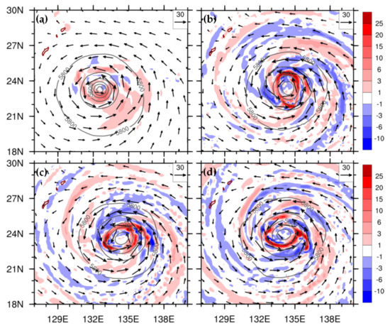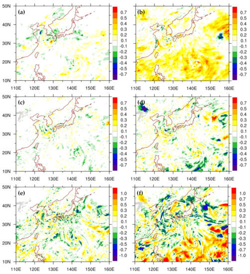 Figure 6 shows the improvement in track prediction mainly attributed to the typhoon movement. The potential vorticity (PV) tendency budget was demonstrated as a useful tool to quantify the typhoon translational speed by diagnosing the asymmetrical wavenumber-1 (WN-1) component (e.g., [45,46,47,48]). The PV is defined by and the prognostic equation of PV can be derived as follows [48]:
