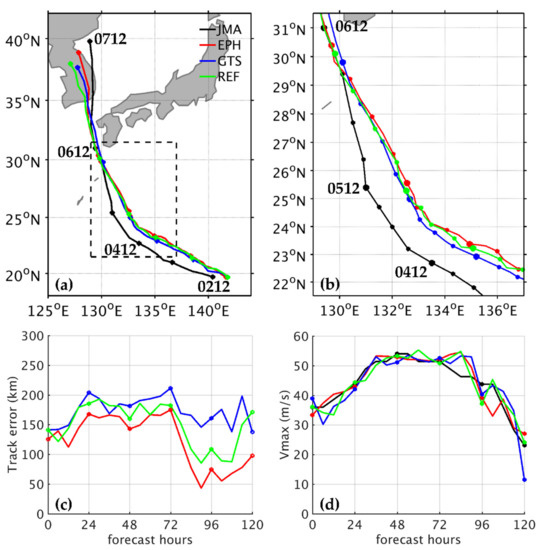 (a) The best track (black) from JMA of Typhoon Haishen (2020) and WRF simulated tracks for GTS (blue), REF (green), and EPH (red) during 1200 UTC 2–7 September 2020. (b) Same as in (a), but for the zoomed region indicated by the black-dashed box in (a). (c) The track errors of Typhoon Haishen (2020) for GTS (blue), REF (green), and EPH (red) during 1200 UTC 2–7 September 2020. (d) as in (c), but are the maximum wind speed (Vmax, in m s−1) for simulated typhoon intensities and best track (in black). Circle symbols indicate the outputs every 24 h.