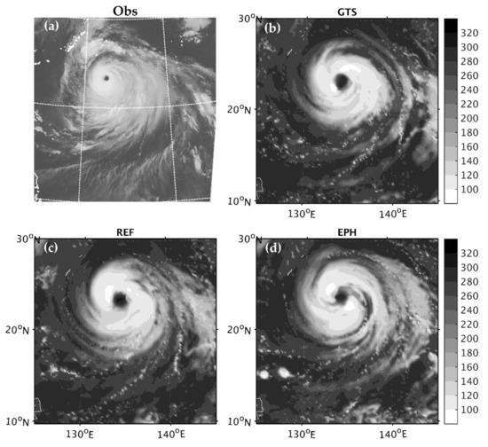 (a) Infrared satellite image from Himawari-8, and the simulated outgoing longwave radiation flux (W m−2) at 1800 UTC 4 September 2020 (54-h forecast) for (b) GTS, (c) REF, and (d) EPH.