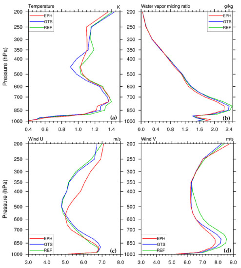 The RMSE of the model forecast for the experiments EPH (red), GTS (blue), and REF (green) verified against the NCEP analysis over 10–30° N, and 130–160° E, for (a) temperature (K), (b) water vapor mixing ratio (g kg−1), (c) east–west wind component (u), and (d) north–south wind component (v), at 48-h forecast (1200 UTC 4 September 2020).