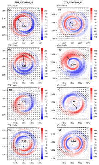 The horizontal wind and wavenumber-1 (WN-1) PV tendency budget (shaded colors, 10−5 PVU s−1) averaged in 1–8 km height at 1200 UTC 4 September 2020 for EPH for (a) net PV budget, (c) horizontal PV advection, (e) vertical PV advection, and (g) differential diabatic heating. (b,d,f,h) as in (a,c,e,g), respectively, but for GTS. The bold reference wind vector (in m s−1) at the vortex center indicates the induced net translation velocity, and a reference wind vector (m s−1) is given in the upper right of each panel for the wind speed.