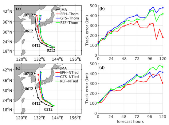 (a) Simulated tracks of Haishen for EPH-Thom (red line), GTS-Thom (blue line), and REF-Thom (green line) experiments and the best tracks of JMA (black line). The Thompson microphysics scheme was used in the three experiments. (b) as in (a) but for track error. (c) as in (a) but using the New Tiedtke cumulus parameterization. (d) as in (c) but for track error. Circle symbols in (a,b) mark the typhoon centers every 24 h.