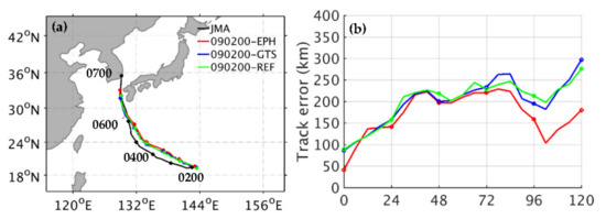 Another sensitivity experiment used the same settings of the control run for GTS, REF, and EPH, but starting the DA 12 h earlier, i.e., performing 1-day cycling DA during 0000 UTC 1–2 September and then 5-day forecasts from 0000 UTC 2 to 7 September. The simulated tracks shown in Figure 12 were close to each other, and the track error for EPH at the initial forecast (0000 UTC 2 September) was largely reduced to 50 km (Figure 12b). Generally, the three simulated tracks were close to those of their control run (Figure 6). From Figure 12b, EPH clearly had the best performance at later stages, while GTS and REF gave nearly indistinguishable tracks throughout the simulation.