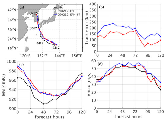 (a) Simulated tracks for EPH (red) and EPH-F7 (blue) and the best tracks from JMA (black). (b–d) as in (a), but for the (b) track errors (in km), (c) MSLP (hPa), and (d) maximum wind speed (Vmax in m s−1), respectively. Circle symbols mark the typhoon centers every 24 h.