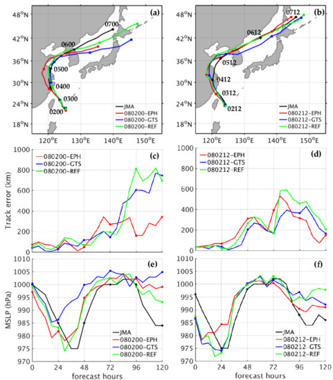 (a) Simulated tracks of Hagupit for experiments, GTS (blue), REF (green), and EPH (red), and the best tracks from JMA (black). The simulated time was from 0000 UTC 2–7 August 2020. (b) as in (a) but for the simulated time from 1200 UTC 2–7 August 2020. (c,d) as in (a,b), respectively, but for track error (km). (e,f) as in (a,b), respectively, but for MSLP (hPa). Circle symbols in (a,b) mark the typhoon centers every 24 h.