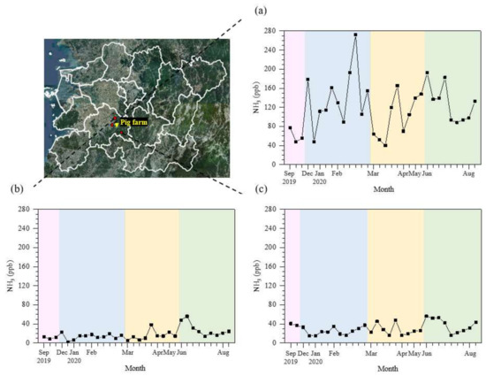 At R3 (~1 km south of R1), the daily average NH3 concentration was 30.4 ± 12.1 ppb ranging from 15.6 to 56.3 ppb (Figure 2c). Seasonally, the average NH3 concentrations were 27.5, 38.2, 38.7, and 25.0 ppb in spring, summer, autumn, and winter, respectively, yielding negligible seasonal variations compared with R2 (Table 1). There are several small-scale mechanically ventilated pig farms near small households at R3. Continuous sources from mechanically ventilated small farms likely caused such stable variation. In addition, a higher average daily NH3 concentration was observed at R3 (30.4 ppb) than at R2 (18.2 ppb) during the entire period, as listed in Table 1.