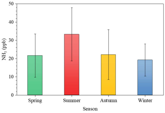 Many studies have reported a strong positive correlation between the ambient NH3 and temperature; the atmospheric NH3 concentration increased with an increase in the ambient temperature [21,26,30,50]. In summer, high temperatures favor the volatilization of NH3 emitted from various sources, such as agricultural activities, leading to a thermodynamically stable phase state as gaseous NH3, rather than particulate NH4+ in the atmosphere [51,52,53]. Our results for the high NH3 levels recorded in summer is consistent with previous results (Figure 3).