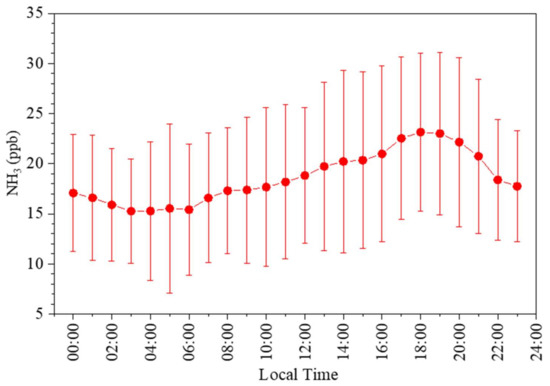 Figure 4 shows the diurnal variation in the ambient NH3 measured at U1 in June 2020. A high NH3 level was maintained in the afternoon with a mean hourly concentration of >20 ppb from 13:00 to 21:00, with a peak value of 23.1 ppb at 18:00. The NH3 concentration then remained low from night to sunrise. Park (2020) also observed a similar diurnal pattern with a single NH3 peak in the late afternoon in June 2019 at an adjacent site, i.e., Samcheon-dong in Jeonju [26]. This ambient NH3 peak was only measured in an urban area characterized by NH3 transported from an adjacent rural area. Previous studies have hypothesized that a single NH3 peak, appearing in the late afternoon, was caused by NH3 emitted from agricultural activities and the evolution of the planetary boundary layer [66,67,68]. In the morning, farmers in rural areas begin to fertilize their land. As the temperature rises in the afternoon, NH3 volatilizes into the atmosphere, with the occurrence of vertical exchange via extension of the mixing layer. These processes can lead to elevated levels of atmospheric NH3 in rural areas; the increasing NH3 concentrations can then be transported to nearby urban areas with increases in the mixing height and wind direction [26,66,67,68,69].