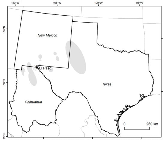 Location of El Paso, Texas with regards to the surrounding states. Major dust source regions impacting the city [,] are shaded.