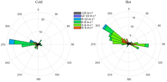 Wind roses representing velocity and direction of sustained wind for hour of maximum PM10 concentration at TCEQ site CAMS-12, El Paso, Texas, on dust exposure dates defined by PM10 during 2010–2014. Cold season (left) includes October through March; hot season (right) includes April through September.