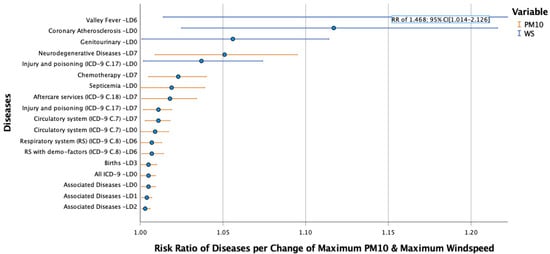 The quasi-Poisson regression results with the maximum hourly PM10 concentration and maximum hourly average wind speed, including meteorological variables, estimated population increase or decrease, seasonality, holidays, and weekdays between the diseases, are shown in Table 3 with their respective lag day (LD), relative risk (RR), and 95% confidence interval (CI). The hospitalizations for ND (LD 7), AD (LD 0–2), chemotherapy (LD 7), respiratory diseases (LD 6), births (LD 3), and septicemia (LD 0) were positively correlated (p-values < 0.05) with maximum PM10, and weekday (p < 0.01). The hospitalizations due to chemotherapy (LD 7), AD (LD 0–2), and respiratory diseases (LD 6) decreased in the cold season and holidays compared to hot season and non-holidays (p < 0.01). The hospitalizations due to births (LD 3) decreased during the holidays compared to non-holidays (p < 0.01). Cases of all ICD-9 diseases (LD 0), circulatory system diseases (LD 0 and 7), aftercare services (LD 7), and injury and poisoning (LD 7) were positively correlated (p < 0.05) with maximum PM10 and weekday (p < 0.01) and decreased in the cold season and holidays compared to hot season and non-holidays (p < 0.01); hospitalizations for all ICD-9 diseases decreased on holidays compared to non-holidays (p < 0.01). The hospitalizations for genitourinary diseases (LD 0), Valley fever (LD 6), and coronary atherosclerosis (LD 0) were positively correlated (p < 0.05) with maximum wind speed and weekday (p < 0.01) with exception of Valley fever. The hospital admissions due to coronary atherosclerosis (LD 0) decreased on holidays compared to non-holidays (p < 0.01). Hospitalizations for all ICD-9 categories and injury and poisoning were positively correlated (p < 0.05) with maximum wind speed on LD 0, increased on weekday compared to weekend (p < 0.01), and decreased in the cold season and holidays compared to hot season and non-holidays (p < 0.01).