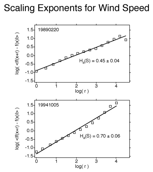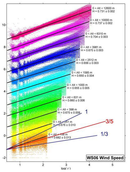 The result addressed in this article is displayed in Figure 1. The data are from 315 GPS dropsondes released by the NOAA G4 research aircraft over the eastern Pacific Ocean in the area bounded by (21–60° N, 128–172° W) during January, February and March 2006; similar data were acquired during 2004 and 2005 [5,6,10,11,12]. The feature to which attention is paid here is the systematic increase with altitude in the value of Hv(s) the scaling exponent in the vertical of the horizontal wind speed, s. H is defined in equations given in references [5,6,12]. There was no theoretical explanation offered for this increase in [12] beyond a remark that the presence of jet streams in the upper troposphere and lower stratosphere may have caused statistical inhomogeneity.