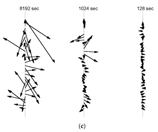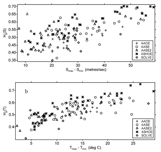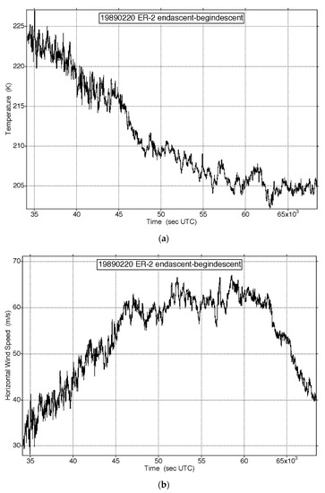 We commence by displaying in Figure 2a,b traces of the temperature and wind speed at 1 Hz from the NASA ER-2 aircraft along the lower stratospheric polar night jet stream 19890220 (yyyymmdd format). This is the longest flight leg available, over one Earth radius [5,13]. Additionally, shown in Figure 2c are the corresponding wind and shear vectors averaged at 8192, 1024 and 128 s intervals; the aircraft flies at a true air speed of 200 ms−1. Similar data from all qualifying ER-2 flight legs 1987–2000 are used to plot the values of H(T) and H(s) against traditional horizontal measures of jet stream strength, the cross-jet (meridional) temperature gradient and the horizontal wind shear, respectively, see Figure 3a,b. Note the positive correlations in each case.