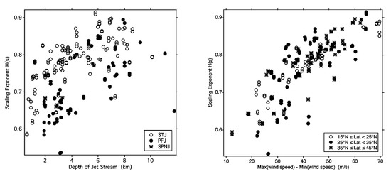 The particular horizontal examples in Figure 2 are extended by plotting the vertical Hv exponents for horizontal wind speed against the vertical wind shear and vertical depth as measured by the dropsondes, traditional measures of jet stream strength. There is a positive correlation in each case. Thus, in both the horizontal and the vertical the scaling H exponents show positive correlations with traditional measures of jet stream strength.