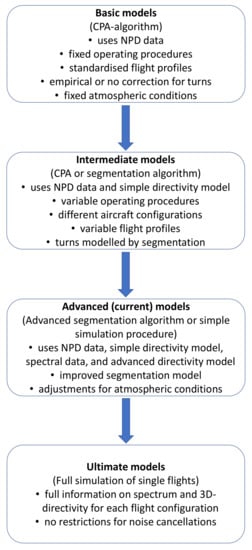 Since the 1970s, the International Civil Aviation Organization (ICAO) has introduced various standards to reduce aircraft noise at the source as part of its balanced approach to aircraft noise management. As part of the initiative, noise standards have been introduced for light, as well as large, propeller aircraft, and jet and supersonic aircraft, as well as helicopters and tiltrotors. The stages of model development can be categorized as shown in Figure 1, with advanced models being currently employed.