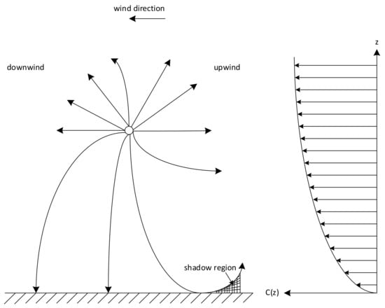 Turbulence can be modelled as a series of moving eddies with a distribution of sizes. Various turbulence models, such as Gaussian, Von Kármán, and Kolmogorov, are used in atmospheric acoustics [26,27,28]. It has been shown that turbulence effects decrease with an increase in the elevation of sound sources from the ground [29]. At lower altitudes, such models may be unsuitable for modelling the large-scale gusts induced in the wake of large infrastructure (such as buildings). Turbulence and gust imparting on the surface of the UA or ingestion by the propulsion system (such as propellers) can also influence the source noise emissions, thereby further adding to the complexity of the problem. As the temperature decreases with height, i.e., for a negative temperature gradient, in the absence of wind, sound waves bend or refract upwards due to the top of the wavefront travelling slower than the bottom. Such conditions usually exist during daytime on sunny days, leading to the formation of shadow zones. Figure 4 shows the refraction of sound due to the wind gradient. A convenient measure of turbulence in the atmosphere is by a dimensionless number known as the Richardson number. The flow is defined as turbulent for values of the Richardson number less than 1 and laminar for values greater than 1 [30].