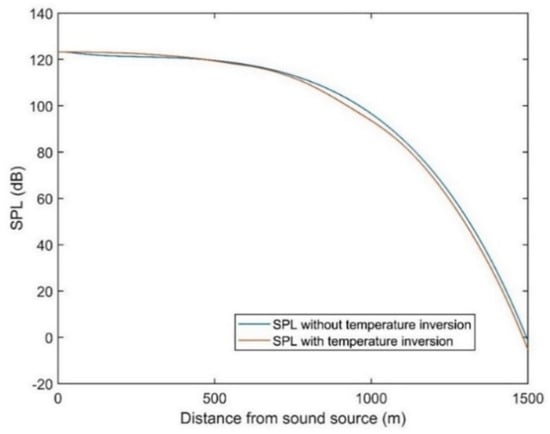 The variation of SPL with distance from the sound source, with and without temperature inversion, is shown in Figure 5. Under normal conditions, the air temperature decreases with height, following a linear relationship. However, as a layer of warm air is overlaid over cool air, there is a reversal of the normal variation of temperature. Depending on the distance from the sound source, thermal inversion can either lead to a higher or lower intensity of sound experienced. Besides the temperature, the sound intensity from sound source to a receiver can vary due to other atmospheric effects, such as varying pressure and wind conditions.
