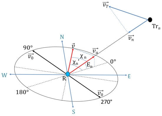 The Doppler effect is responsible for the perceived change in sound frequency due to the relative motion between the sound source and receiver. Figure 6 shows the elevation angle (En) of the nth transmitter (Trn) to the receiver (R), as well as the relative bearing (χn), the tangential velocity of the transmitter (), and the azimuth of the LOS projection (). is the velocity of the receiver and the case of results in a null Doppler shift, as no component of the receiver velocity vector is in the direction of LOS to the emitter. As is evident from Equation (22), the Doppler shift is inversely proportional to both the elevation and azimuth angle. The pitch increases as the relative distance between the sound source and receiver decreases. The change in observed frequency of sound is given as: