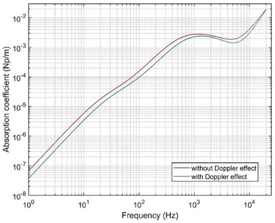 where M is the Mach number for the sound source and θ is the direction of the receiver to the sound source at the time (t + ). The variation of the attenuation coefficient for air absorption, α, with frequency, while accounting for the Doppler effect, is shown in Figure 7. It can be observed that the frequency shift due to the Doppler effect for sources traveling towards the receiver increases the absorption coefficient for any given frequency.