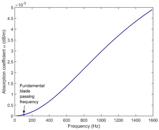 The attenuation coefficient, α, for air absorption depends on the frequency, humidity, temperature, and pressure, with its value being calculated using Equation (15) [14].
