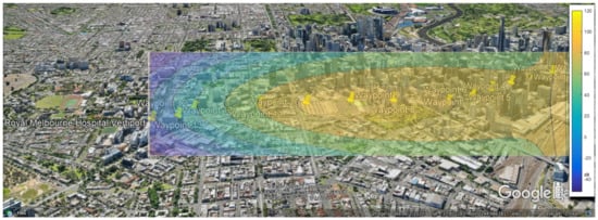 Urban environments are characterised by a significant number of obstacles, sometimes rising above the operating altitude of the vehicles. Researchers have therefore extended their investigation to consider multipath and diffraction phenomena affecting UA noise in urban environments. Bian et al. [33] have conducted a parametric study using a Gaussian beam tracing solver to assess the noise impact of UAs in a realistic environment. The acoustic field at observer points, which are mostly at distances greater than 10 times the rotor radius, is determined by modelling the expansion of multiple Gaussian beams. A ray-tracing module is used to determine the trajectory of each beam, with noise contributions by all beams in the vicinity of an observer point integrated to obtain the acoustic field at that point.